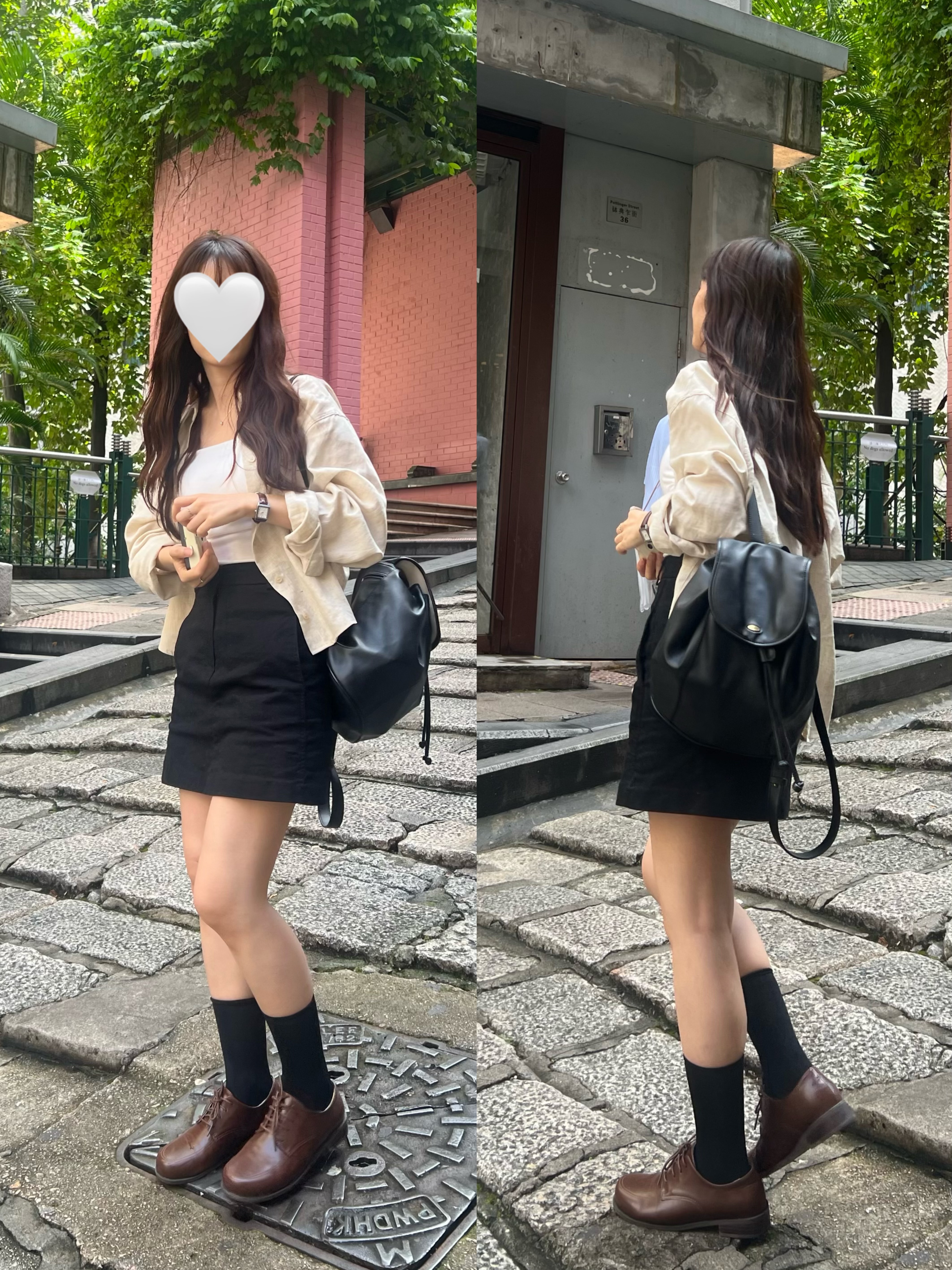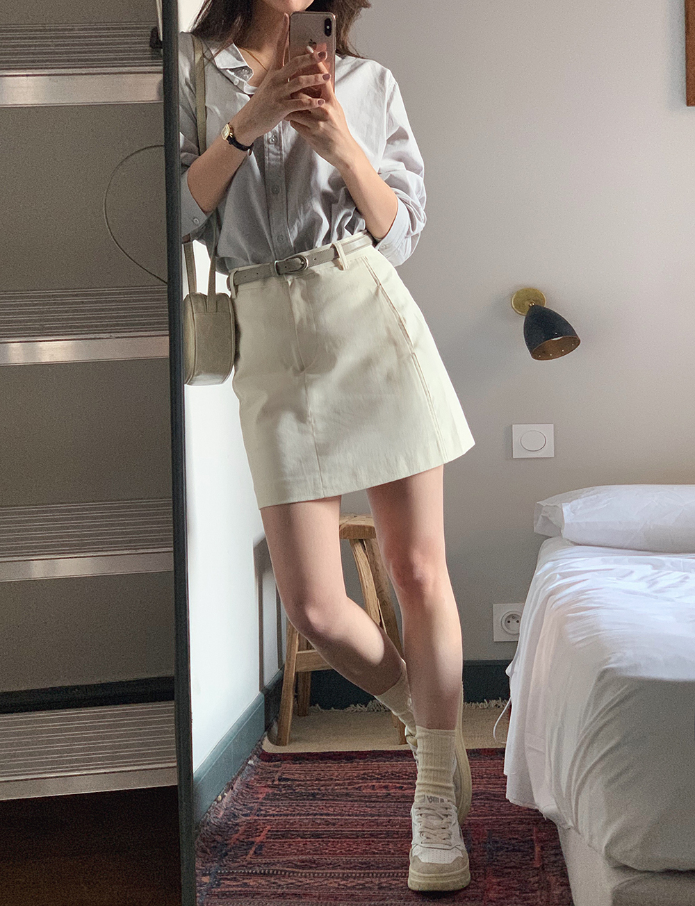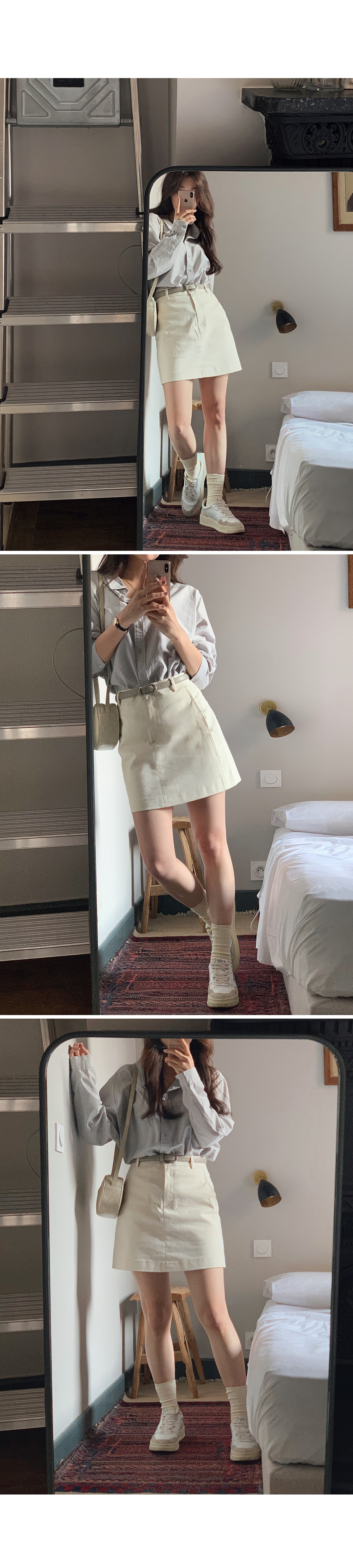BRA TOP: SD003米白色長版/ 恤衫:SD1138燕麥色/ 短裙:SD1047黑色XS / 背囊:SD1110黑色 / 頸鏈:HA067 / 戒指:HA200
