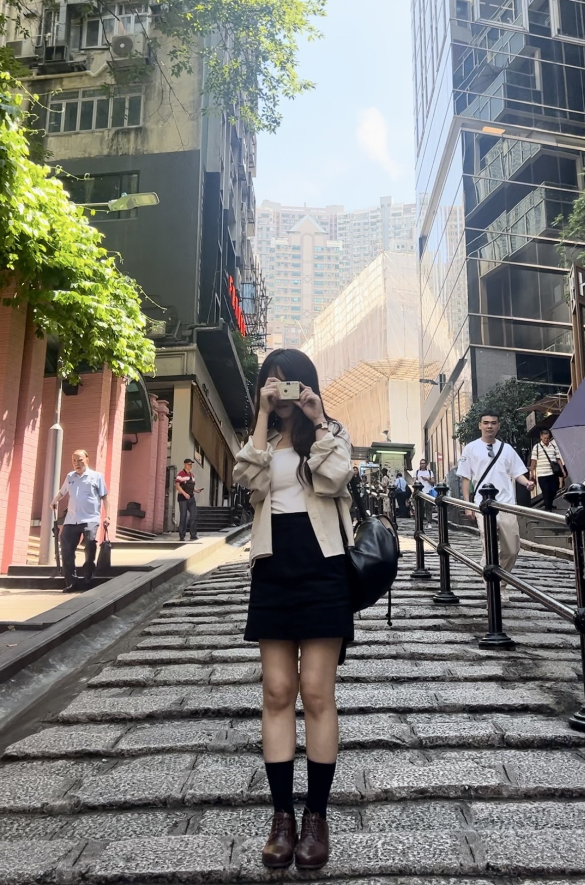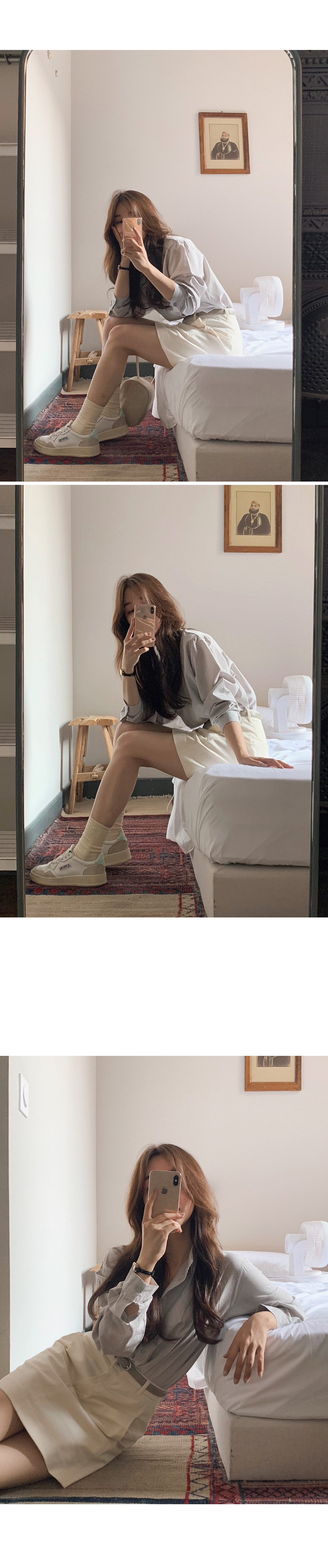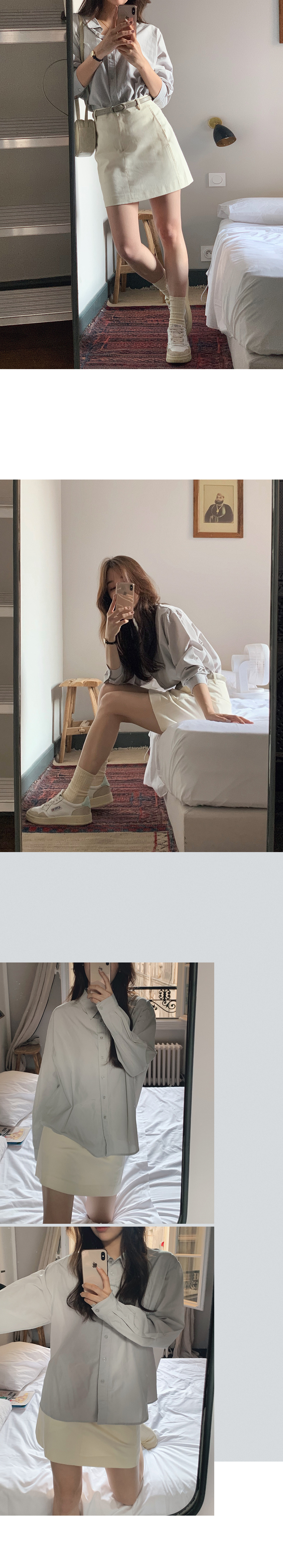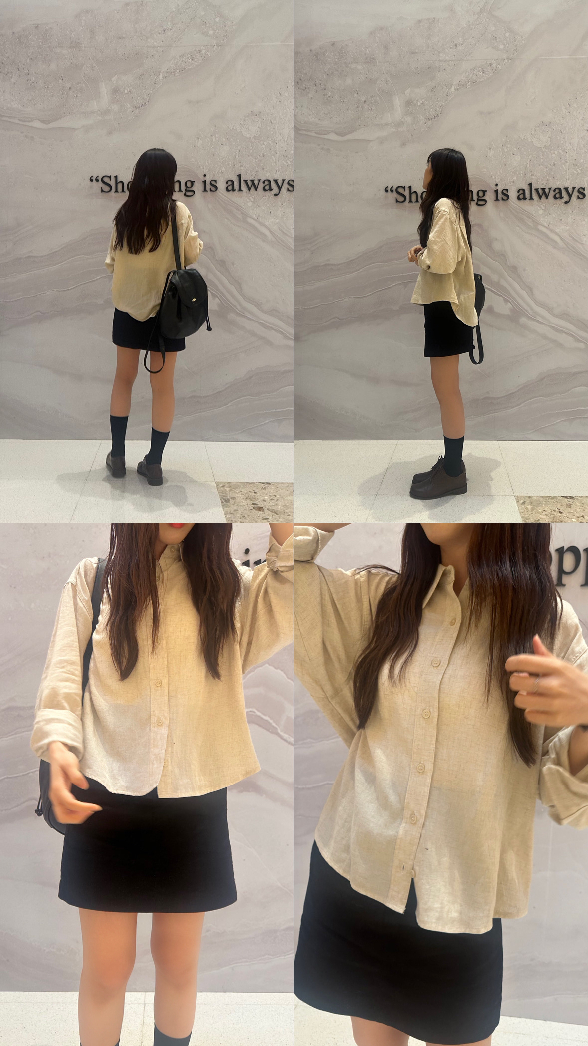 BRA TOP: SD003米白色長版/ 恤衫:SD1138燕麥色/ 短裙:SD1047黑色XS / 背囊:SD1110黑色 / 頸鏈:HA067 / 戒指:HA200